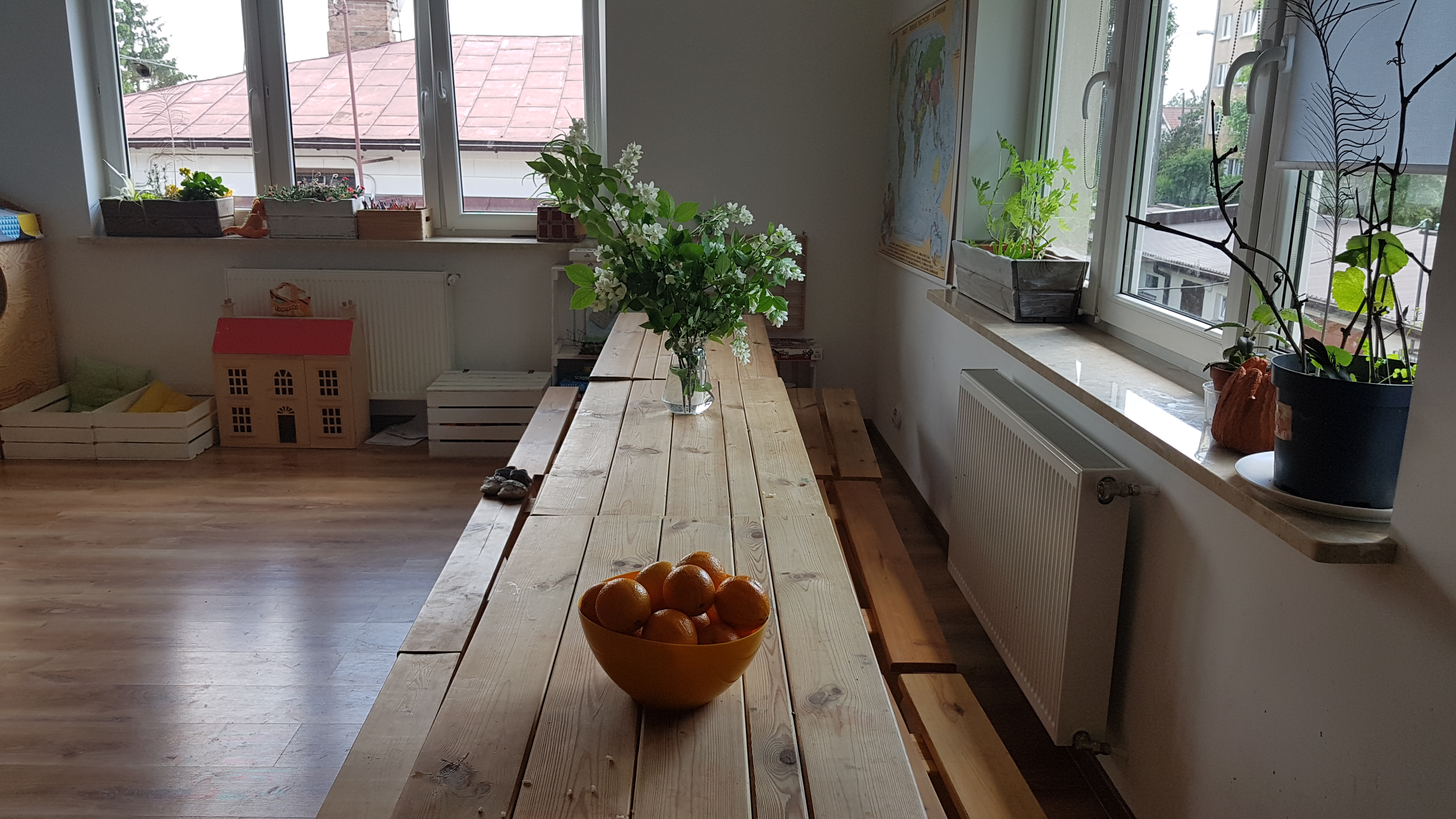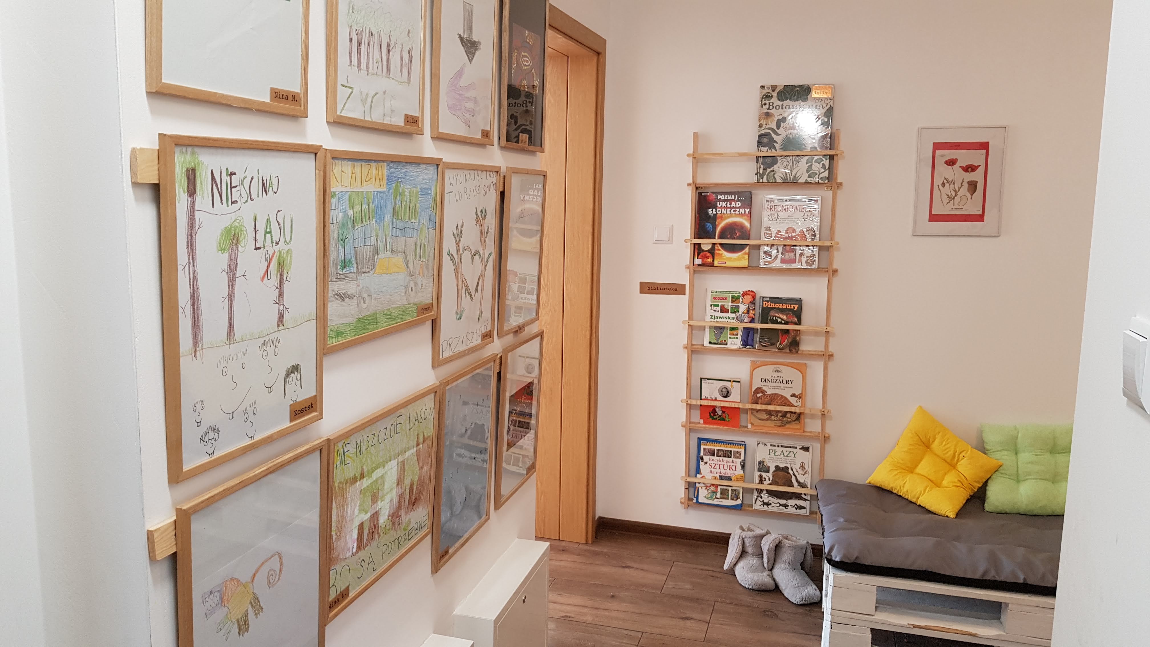 Lubimy minimalizm i proste wzornictwo, bliska jest nam idea zrównoważonego rozwoju i ochrona środowiska. Dlatego w naszej szkole staraliśmy się korzystać z naturalnych materiałów, odzyskiwać i odnawiać przedmioty używane. Ważna dla nas jest estetyka przestrzeni, w której pracujemy. W naszej szkole mamy trzy sale: główną z jadalnią i kuchnią, artystyczną (humanistyczną) i laboratorium (ścisłą).